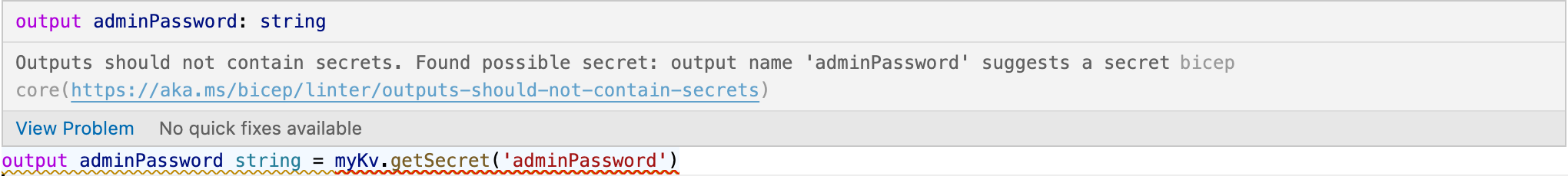 | adminPassword: myKv.getSecret('adminPassword') | |