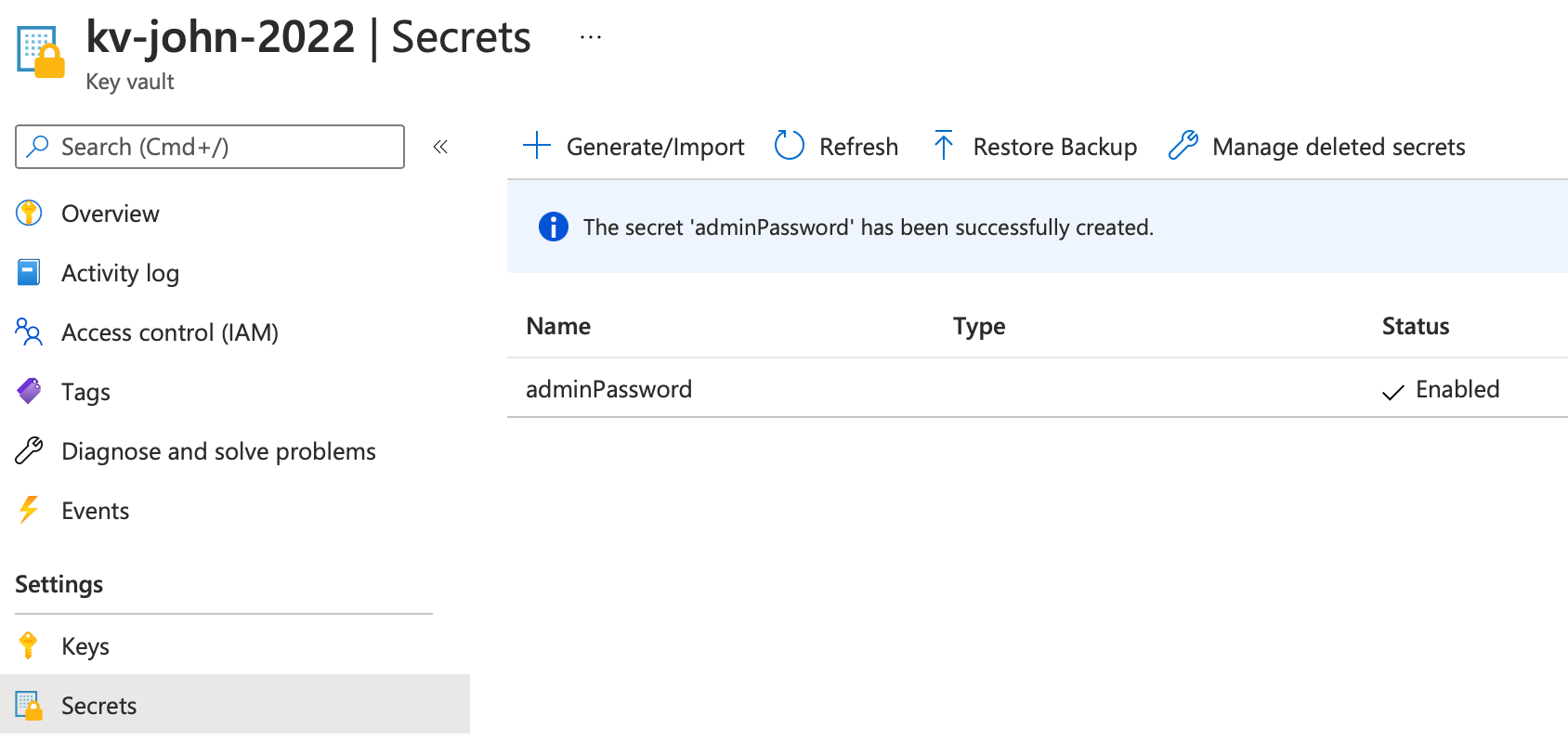 In this scenario we are working with an existing key vault. In this key vault I added the secret adminPassword. This secret is going to be the admin password for a virtual machine.