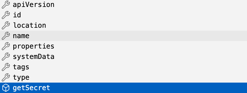 Now we have done this, there is a reference to the key vault kv-john-2022. The key vault resource contains some properties and a getSecret method. This is the method we need to retrieve the secret from the key vault.