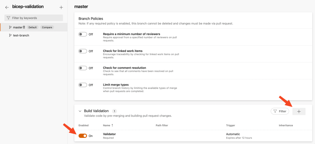 Next you need to set up a build validation policy so the pipeline triggers on every pull request.