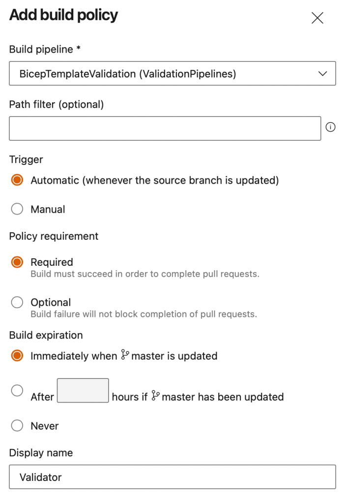 Refer to the validation pipeline you created. Set the build expiration to βimmediatelyβ so the pipeline always triggers on new pushes to the pull request, also after the pull request has been created. Also the trigger is set to automatic so the pipeline always runs a pull request is created.