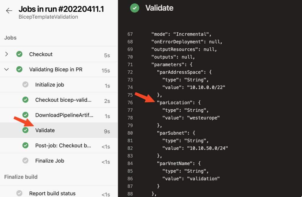 If you look at the pipeline output you see the added parameter parLocation in our validation. This is the change we made in the feature branch, which is being validated in the pull request.