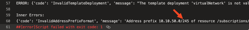 Letβs take a look at what happens if you make a typo in a parameter. For example, you make a typo in the CIDR notations of the subnet address. Instead of assigning a CIDR-block of /24 I assigned a CIDR-block of /245.