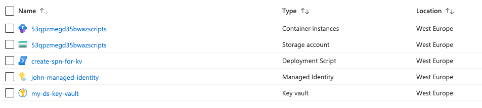 The resources defined in the example are key vault, managed identity and deployment scripts. The storage account and container instances are created by the deployment script and the names are randomly generated.
