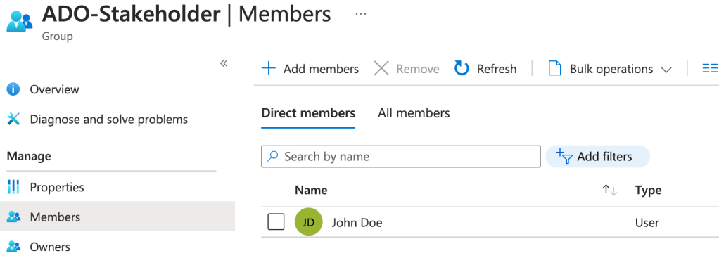In the example below I added two Azure AD security groups to the group rule list: ADO-Basic and ADO-Stakeholder. Besides that, I have added the users John Doe and Jane Doe to one of each security group.