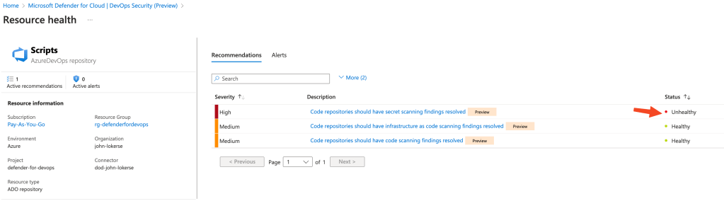 From the overview, you can click on the repository name. This brings you to the Resource health overview. In the image below you see both healthy and unhealthy security alerts.
