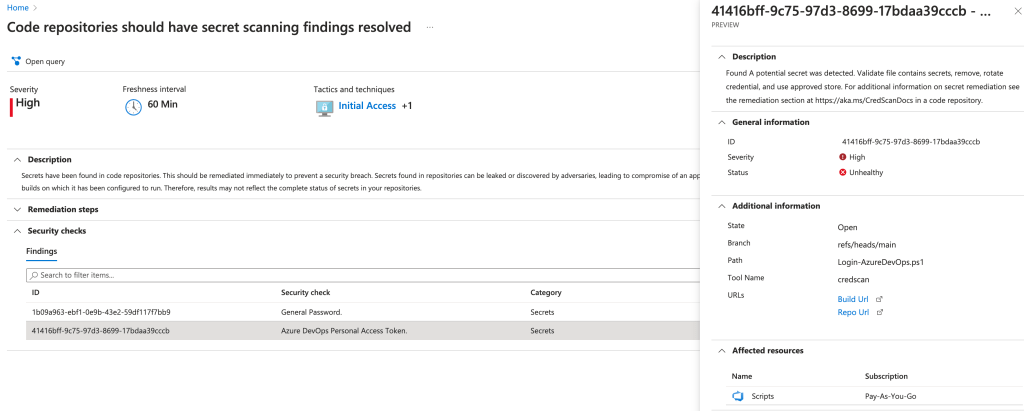 By clicking on the security alert description you get more information about the alert. For example, each finding contains information about the branch in which the secret was found and in what script the secret was found. Also, Defender for DevOps gives you the link to the build and repository.