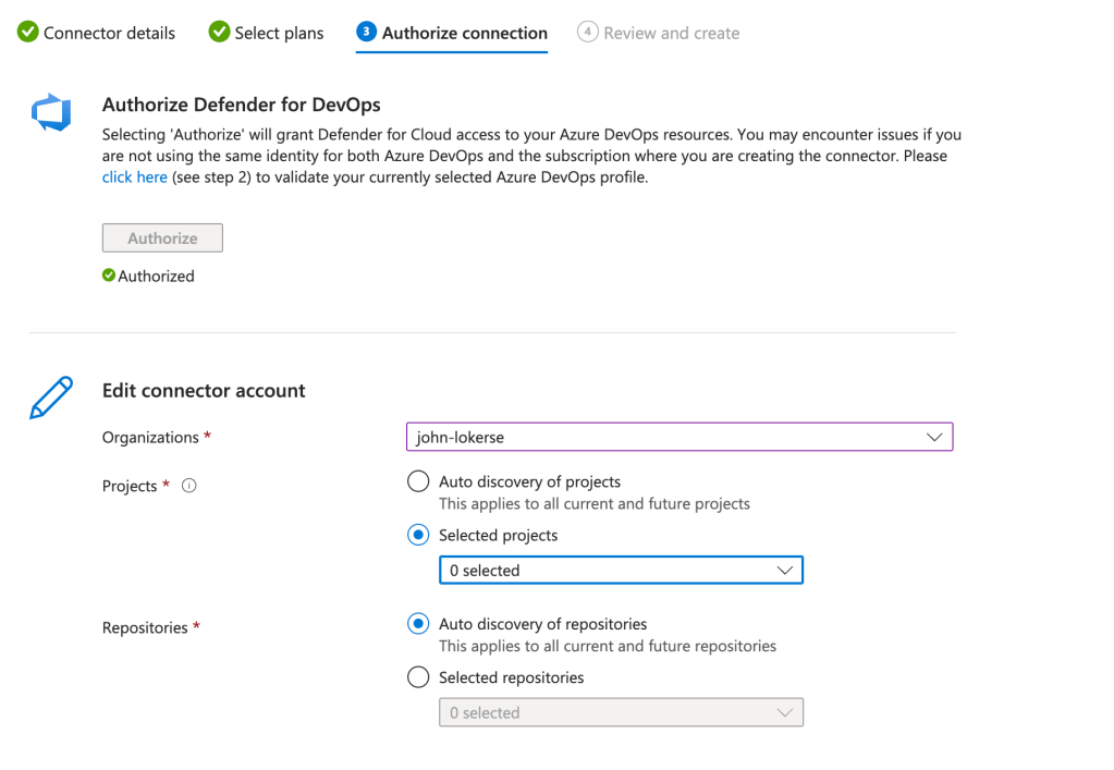 auto discovery for projects and repositoriesor select repositories you want to connect to Defender for DevOps.