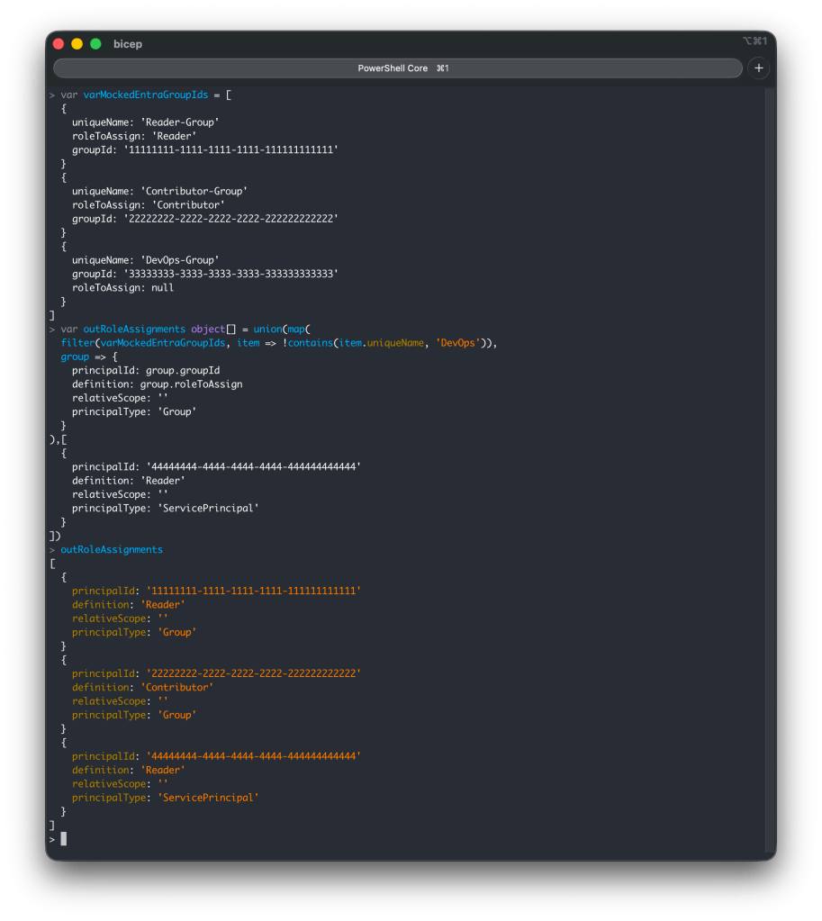 The purpose of the example below is to produce an output that fits the role assignment format used by the Azure Verified Module (sub-vending module). First, the array varMockedEntraGroupIds (containing mock data) is declared in the console and represents the data used in a parameter of a Bicep template. The variable outRoleAssignments is the output of the Bicep template. This is where the lambda expressions are applied to create the exact role assignment pattern the AVM module expects. Assigning outRoleAssignments to a variable is optional, you can also use the right-hand value directly.