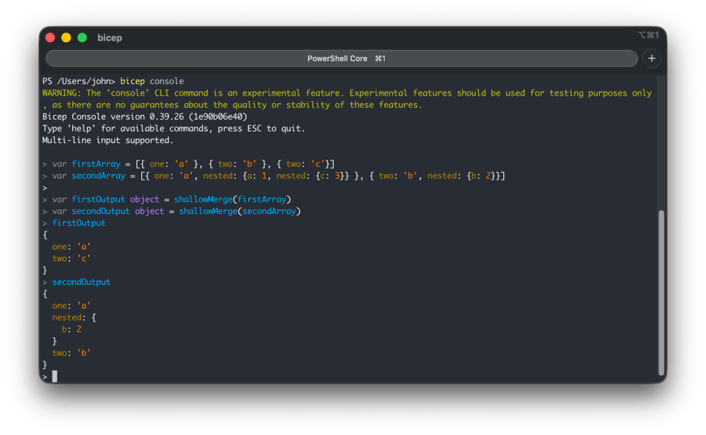 The bicep console does not support the output keyword, so these should be changed to variables (var), or you can directly run shallowMerge(<input>). Below you see the output: