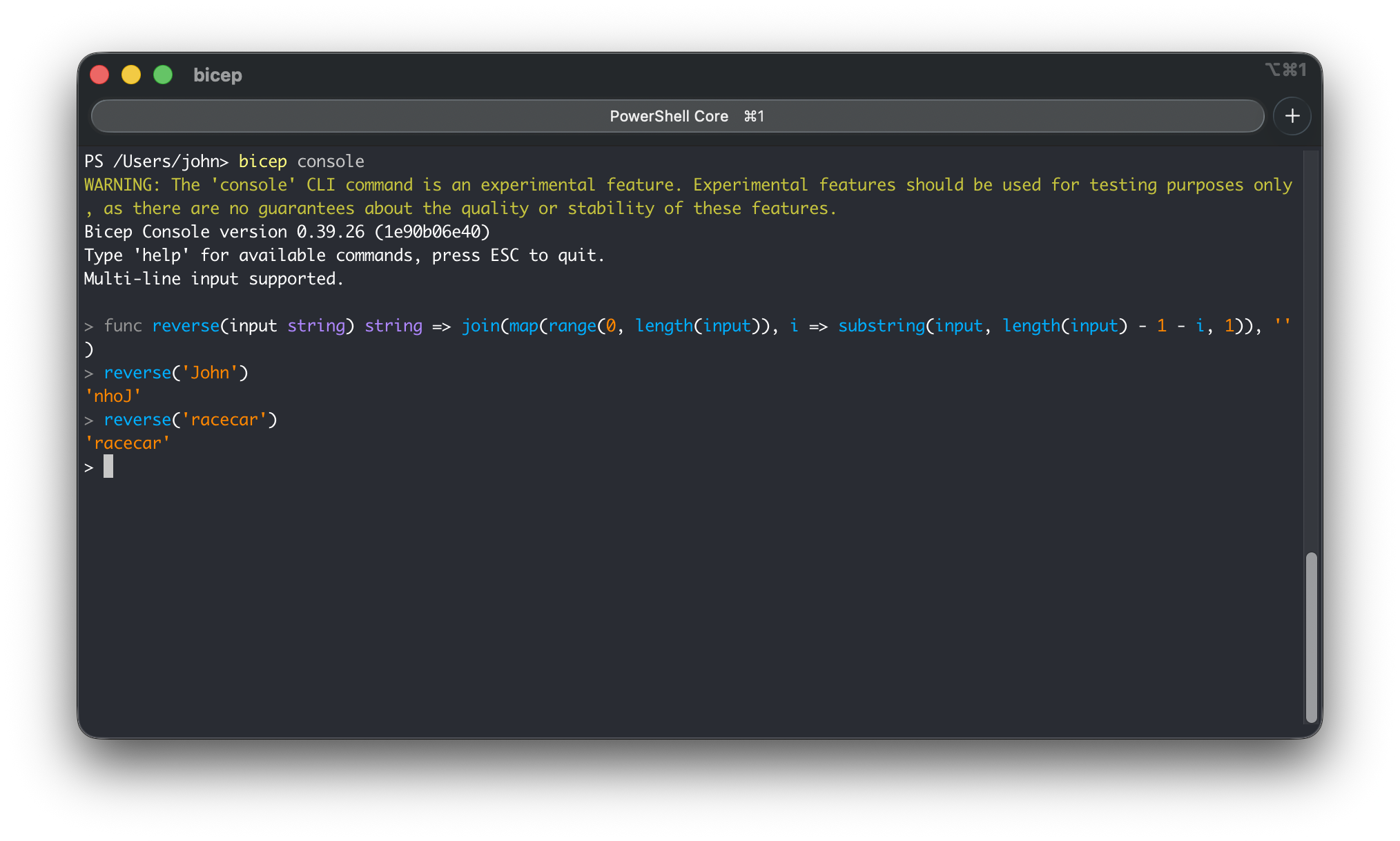 Now, with the Bicep console, you only need to start bicep console and run your expression.