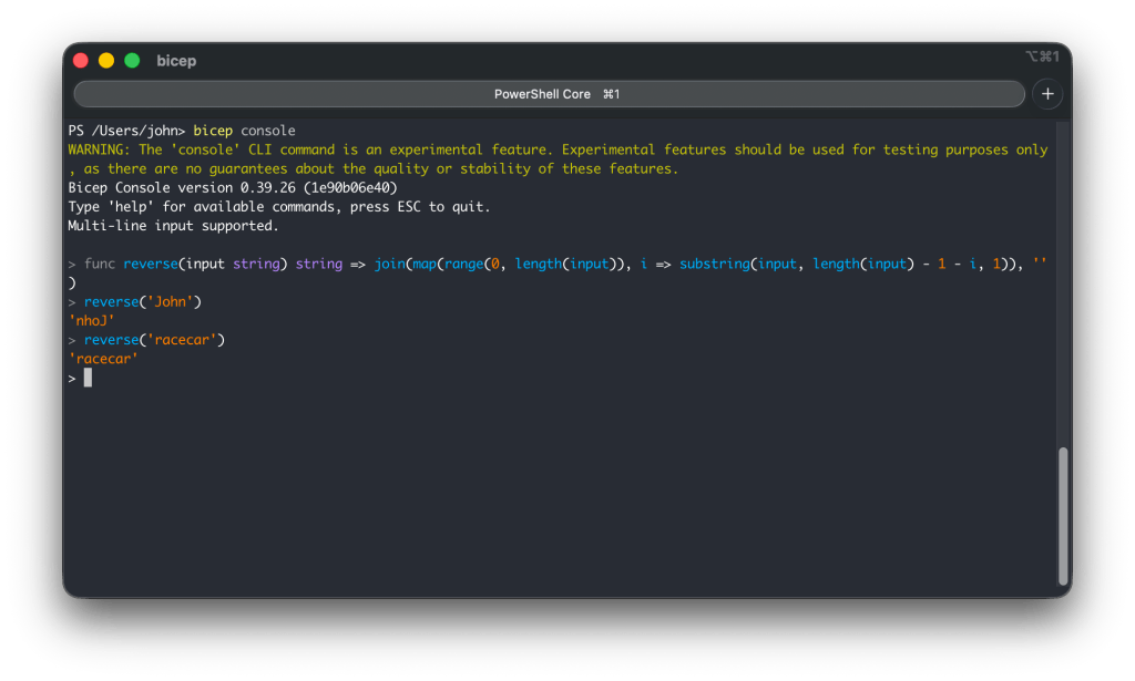 The Bicep console may still be experimental, but it already deliver value when working with Azure Bicep. Whether you are validating complex expressions, experimenting with new features, or iterating on user-defined functions, the console gives instant feedback without spinning up a full deployment. It becomes even more powerful with combining it using GitHub Copilot, where you let an agent generate user-defined functions and validate it directly on the bicep console.