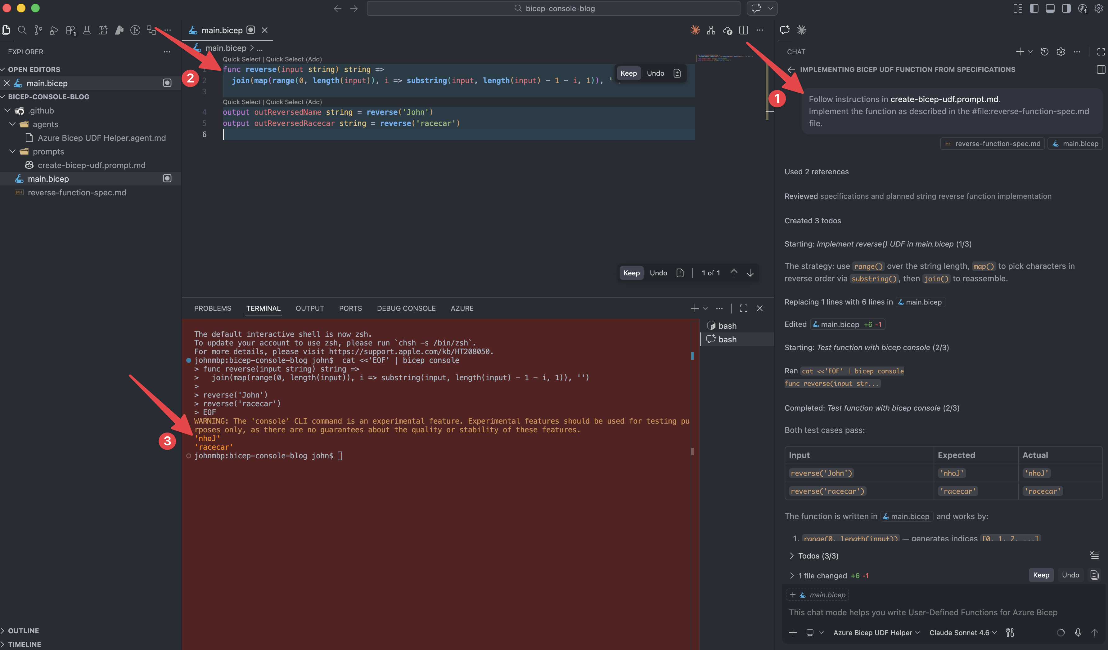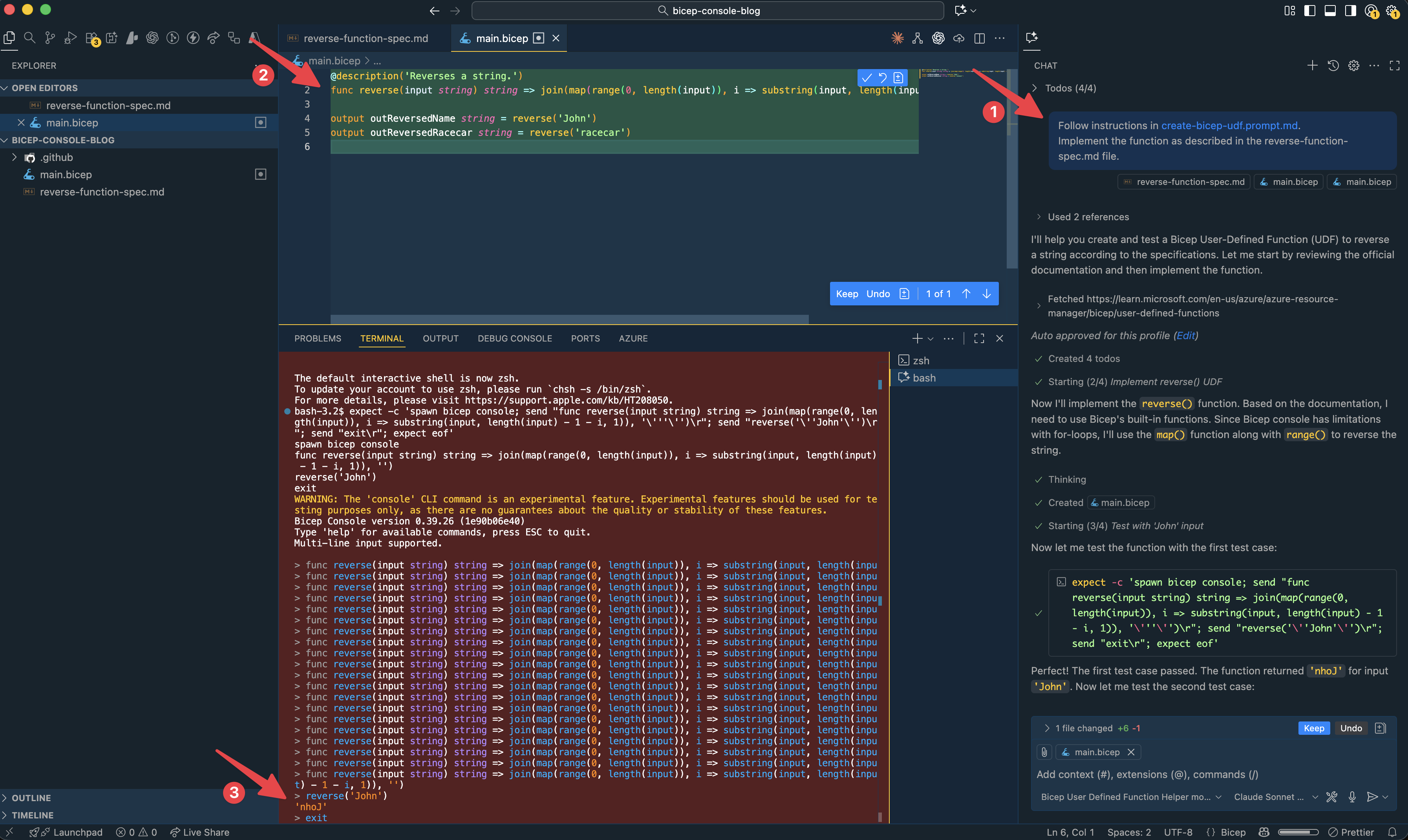 /create-bicep-udfand the specification is given to GitHub Copilot. - GitHub Copilot has generated the function based on the specification file.