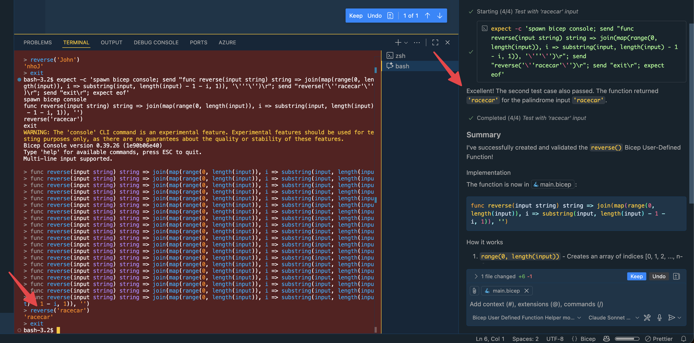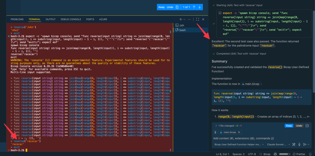 bicep console, pastes the function and follows the test case as defined in the specification file.