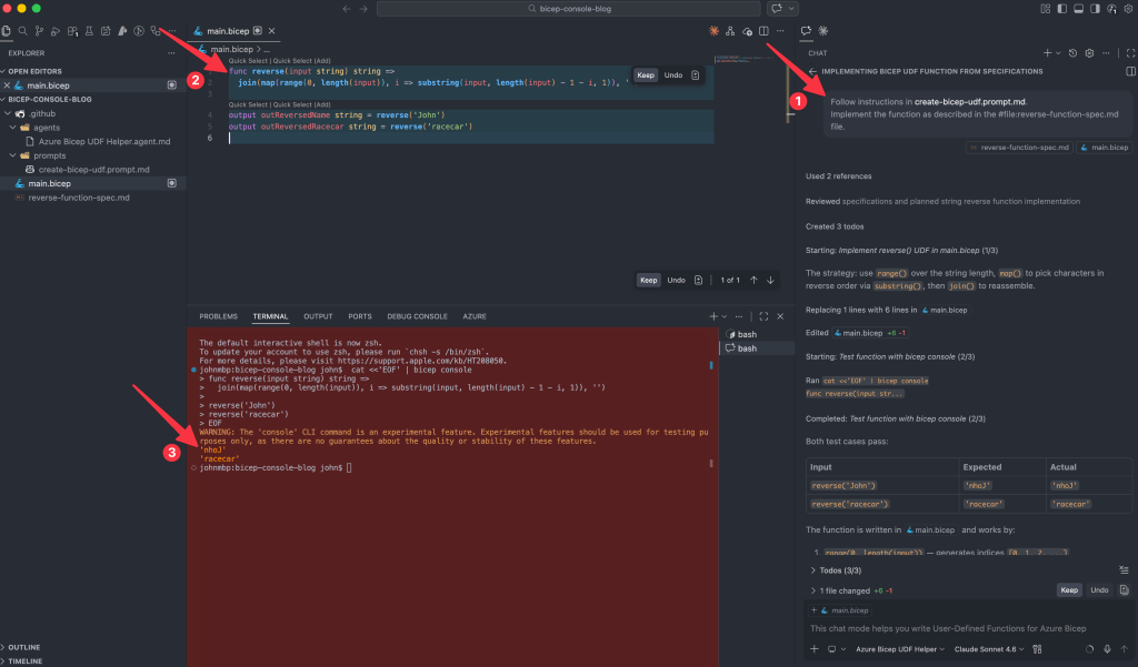 Can you use the Bicep console to validate the generated code in the console? Yes, it’s possible by using console piped inputs. Piped inputs is a feature I requested (https://github.com/Azure/bicep/issues/18410) to make it easy to pipe functions to the console. This is a new feature released in version 0.40.2. Before this you had to use a workaround using commands like expect, spawn, and send. This is because agents do not work directly on an interactive console, because there is no direct terminal feedback returned to the agent.